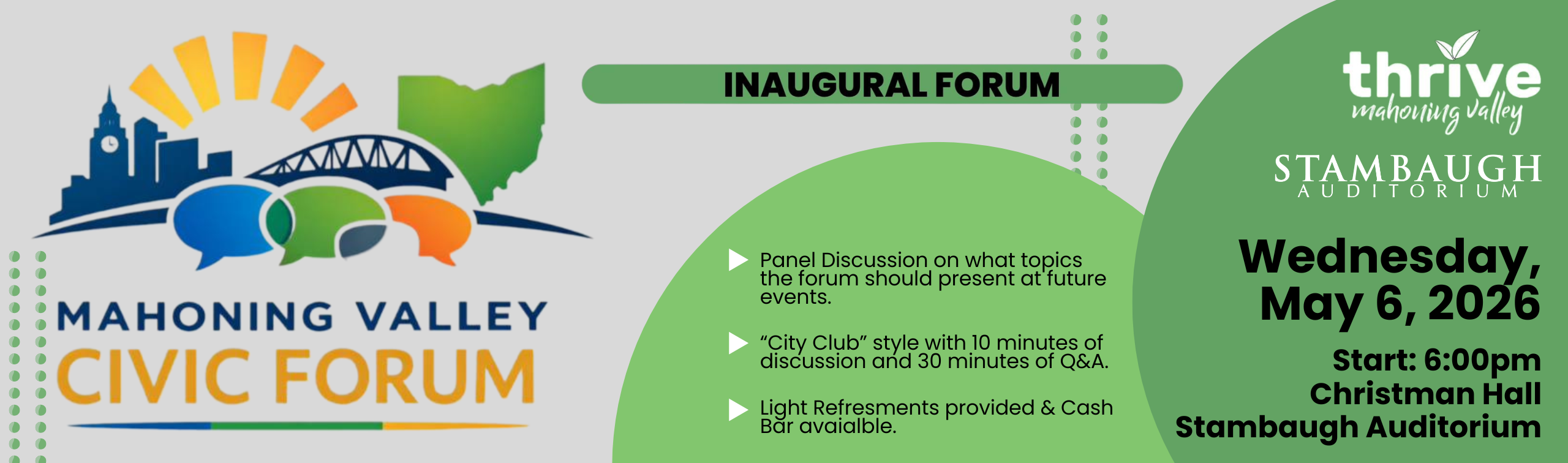 Join us for the first discussion of the Mahoning Valley Civic Forum. We will be discussing what the Forum should be talking about in future panels and ticketed events. We will chat “City Club” style with 30 minutes of open dialogue with members of our advisory council, and 30 minutes of Q&A with attendees. Refreshments provided